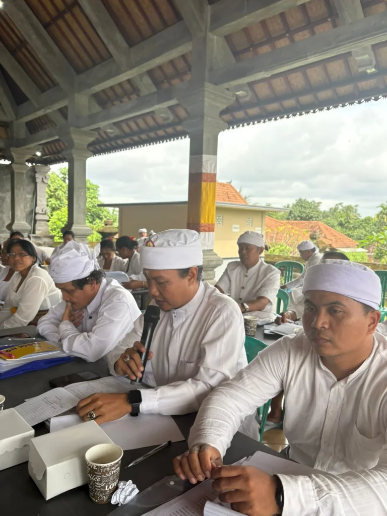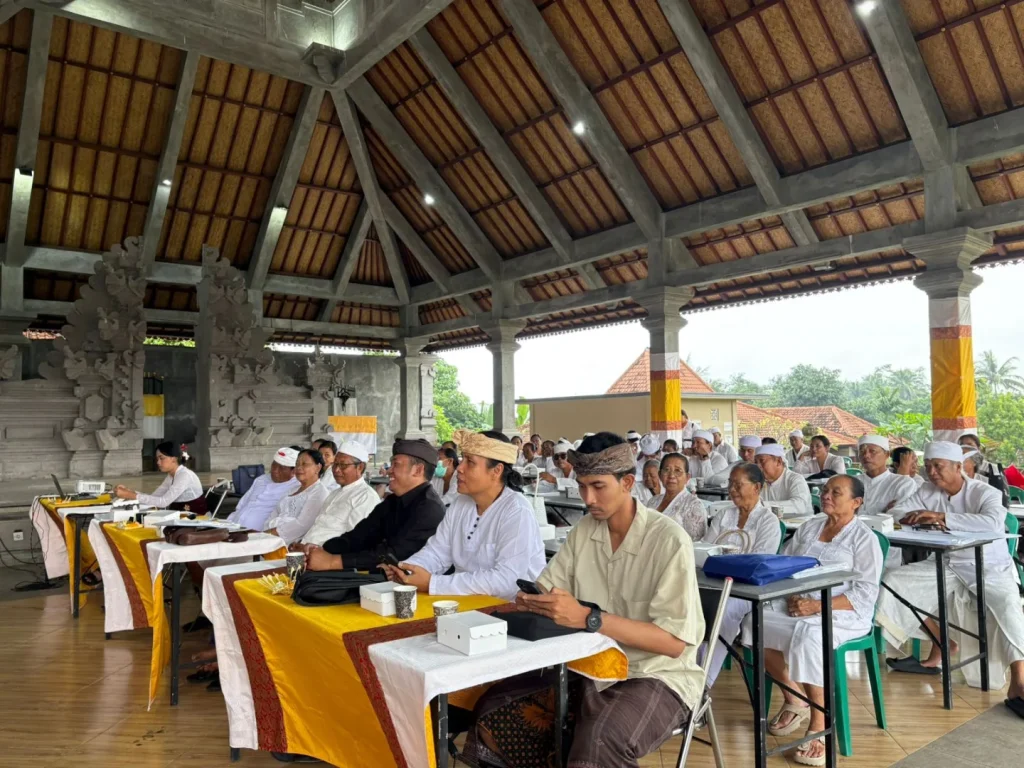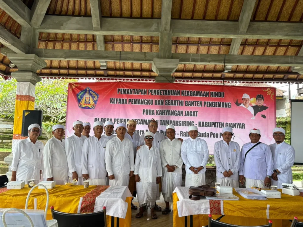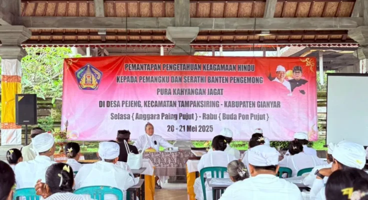 Biro Pemerintahan dan Kesejahteraam Rakyat melaksanakan kegiatan peningkatan pengetahuan keagamaan pemangku dan serathi banten pura kahyangan jagat pada hari kedua di wantilan pura pusering jagat Desa Pejeng, Kecamatan Tampaksiring, Kabupaten Gianyar pada Hari Rabu, 20 Mei 2025