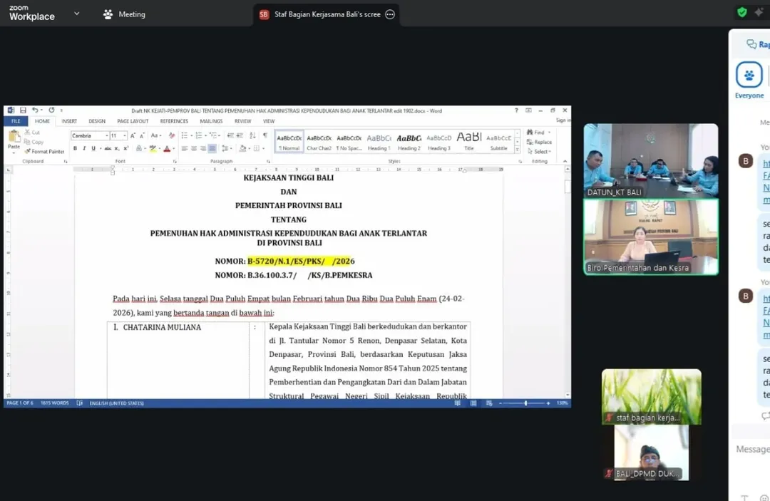 Kepala Biro Pemerintahan dan Kesejahteraan Rakyat (I Made Supartha, AP., MT) didampingi Ibu Kepala Bagian kerjasama beserta Tim TKKSD Provinsi Bali, memfasilitasi rapat pembahasan Naskah Nota Kesepakatan antara Pemerintah Provinsi Bali dan Kejaksaan Tinggi Bali tentang Pemenuhan Hak Administrasi Kependudukan Bagi Anak Terlantar di Provinsi Bali melalui Zoom Meeting pada hari Kamis, 19 Februari 2026