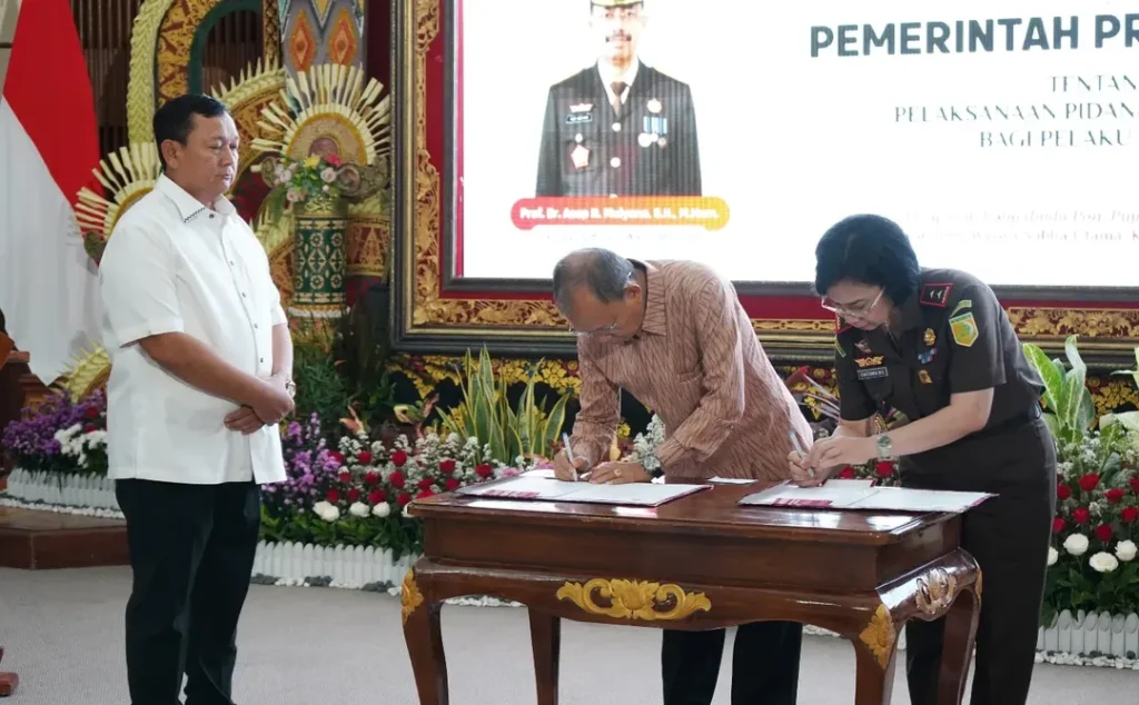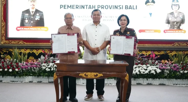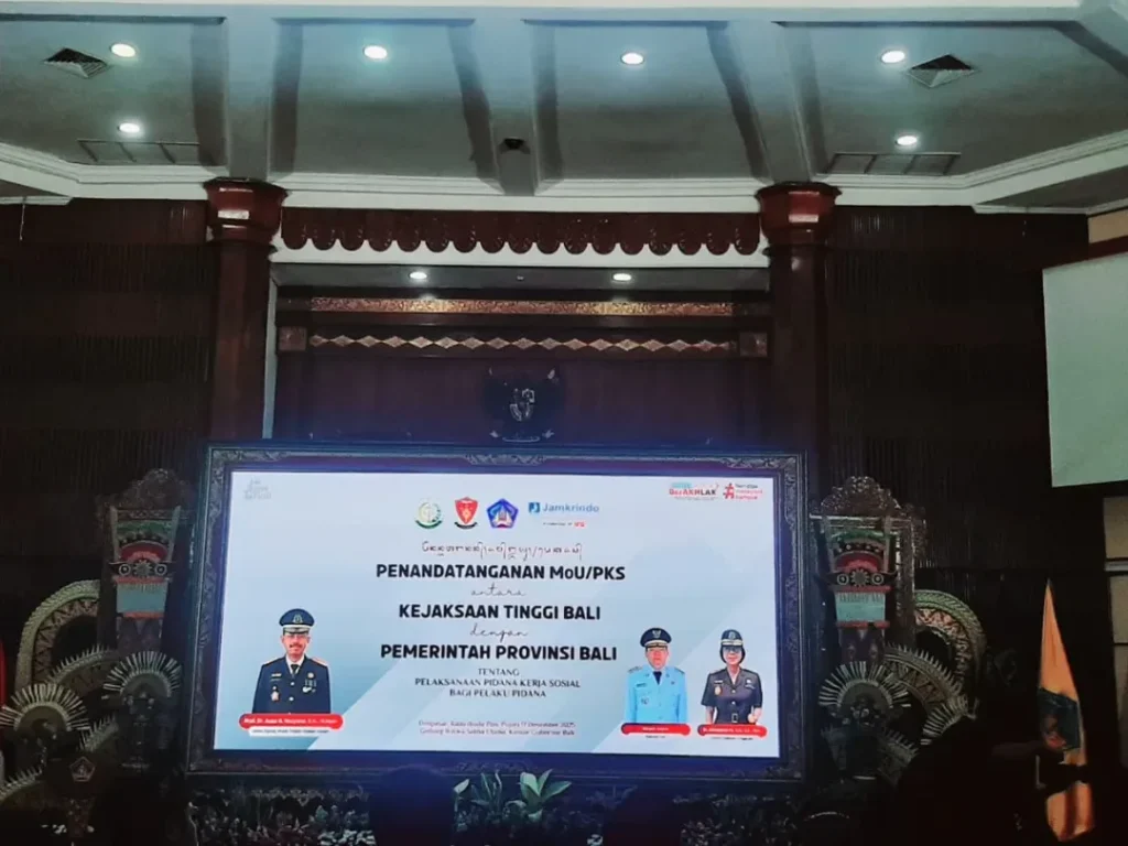 Penandatanganan naskah kerja sama antara Kejaksaan Tinggi Bali dan Pemerintah Provinsi Bali tentang Pelaksanaan Pidana Kerja Sosial Bagi Pelaku Tindak Pidana bertempat di Gedung Wiswa Sabha Utama Kantor Gubernur Bali pada hari Rabu, 17 Desember 2025