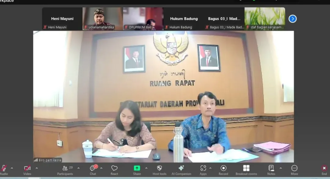 Kepala Biro Pemerintahan dan Kesejahteraan Rakyat (I Made Dwi Arbani, S.ST., M.Si) didampingi ibu Kasubbag Kerjasama memfasilitasi naskah finalisasi Perjanjian Kerjasama antara Pemerintah Provinsi Bali dengan Pemerintah Kabupaten Badung,Pemerintah Kabupaten Gianyar dan Pemerintah Kota Denpasar tentang Bantuan Keuangan Khusus Proyek Strategis Provinsi Bali dan Pembangunan Infrastruktur, Sarana-Prasarana Strategis Serta Pengembangan Kualitas Objek Pariwisata di Kabupaten Bangli, Kabupaten Buleleng, Kabupaten Jembrana, Kabupaten Karangasem, Kabupaten Klungkung dan Kabupaten Tabanan secara daring pada hari selasa, 15 juli 2025