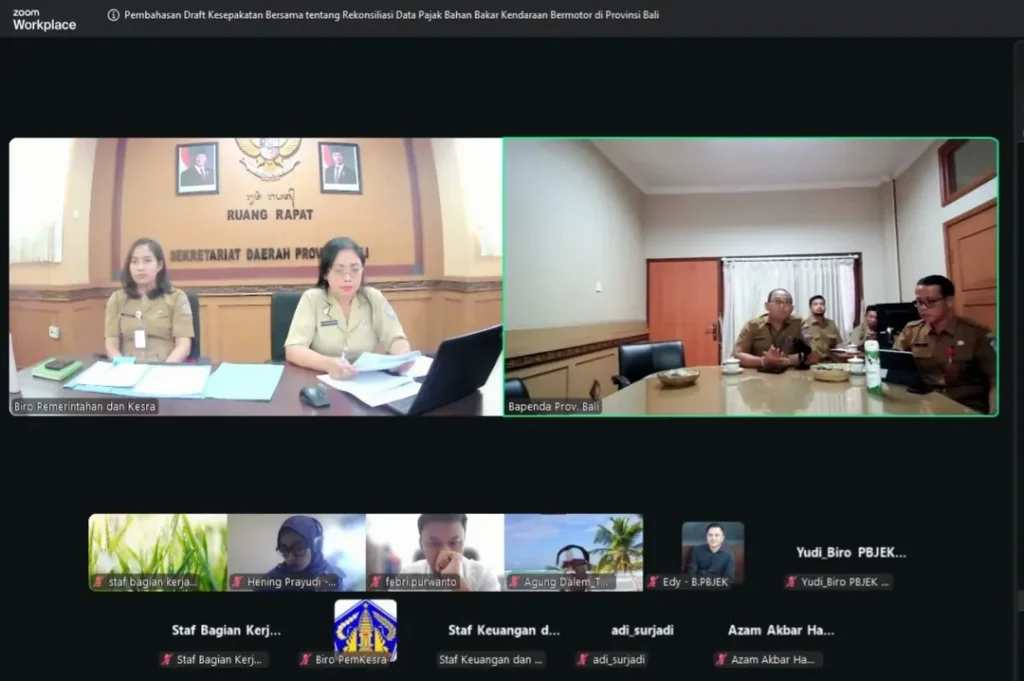 Biro Pemerintahan dan Kesejahteraan Rakyat memfasilitasi rapat pembahasan draft Kesepakatan Bersama tentang rekonsoliasi data pajak bahan bakar kendaraan bermotor di Provinsi Bali melalui zoom meeting pada hari Senin, 13 April 2026