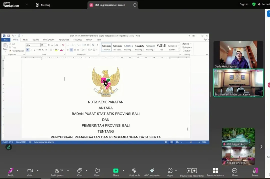 Biro Pemerintahan dan Kesejahteraan Rakyat melaksanakan rapat pembahasan draft nota kesepakatan antara Badan Pusat Statistik dengan Pemerintah Provinsi Bali tentang penyediaan, pemanfaatan dan pengembangan data serta informasi statistik dalam rangka pembangunan daerah secara daring pada hari Rabu, 18 Juni 2025